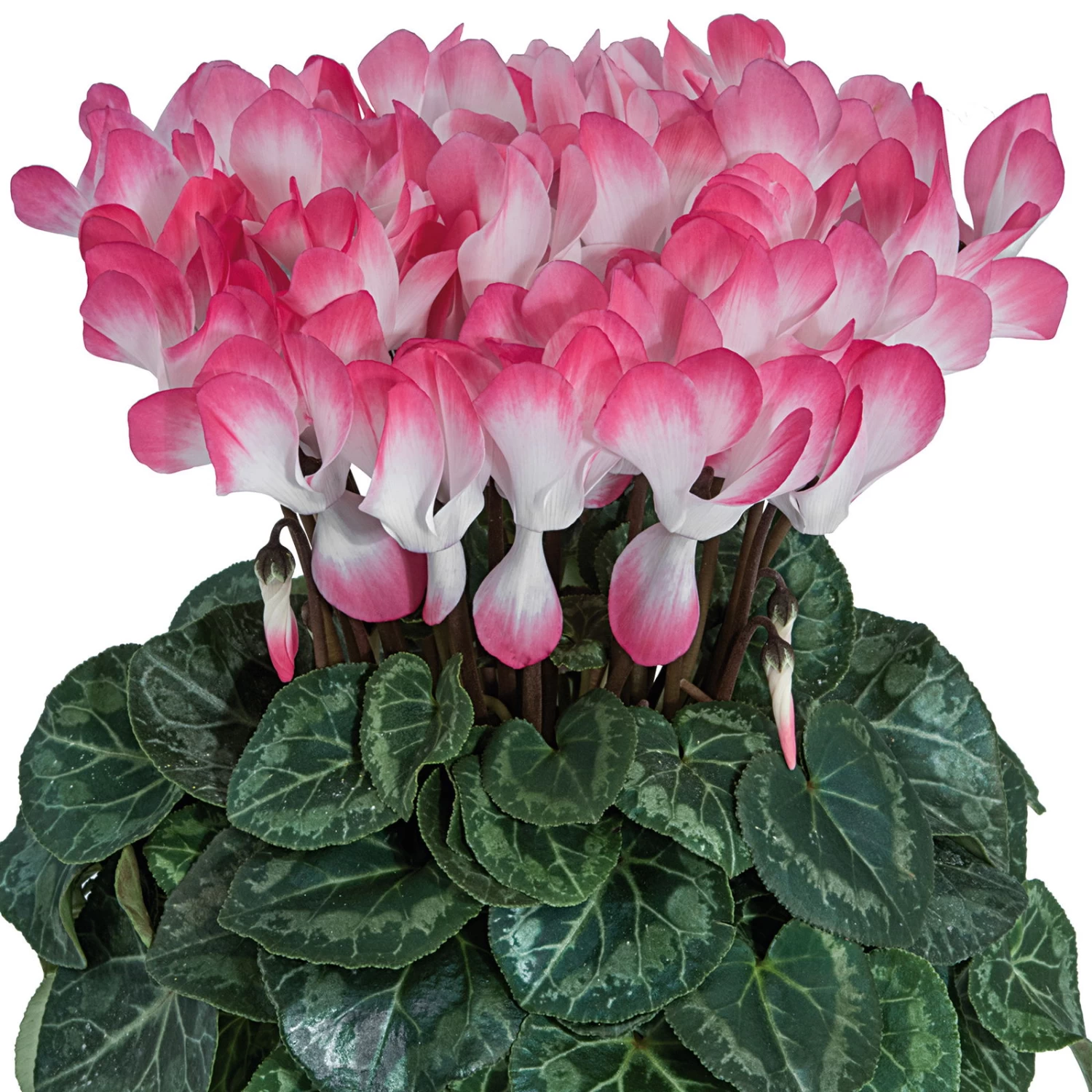 Die zweifarbigen Blüten des Alpenveilchens Indiaka® sind kronenähnlich und haben einen glatten Rand. Sie sitzen an langen Stielen oberhalb der Blätter. Die Blütezeit beginnt ab August und reicht bis in den Dezember hinein. Die zweifarbig geflammten Blüten in rosa-weiß, rot-weiß, magenta-weiß oder lila-weiß bringen Abwechslung in Ihre Bepflanzung. Die Farben werden nach Verfügbarkeit geliefert.