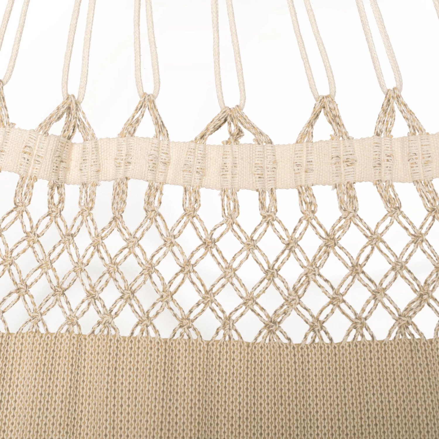 Mit einer komfortablen Größe von 180 x 400 x 180 cm ist die beigefarbene Kingsize Hängematte ‚Bossanova‘ ein idealer Erholungsort für die ganze Familie. Sie ist aus Bio-Baumwolle gefertigt und mit reißfesten Webkanten versehen. Deshalb hat sie eine hohe Belastbarkeit von 200 kg. Freuen Sie sich auf entspannende Stunden!