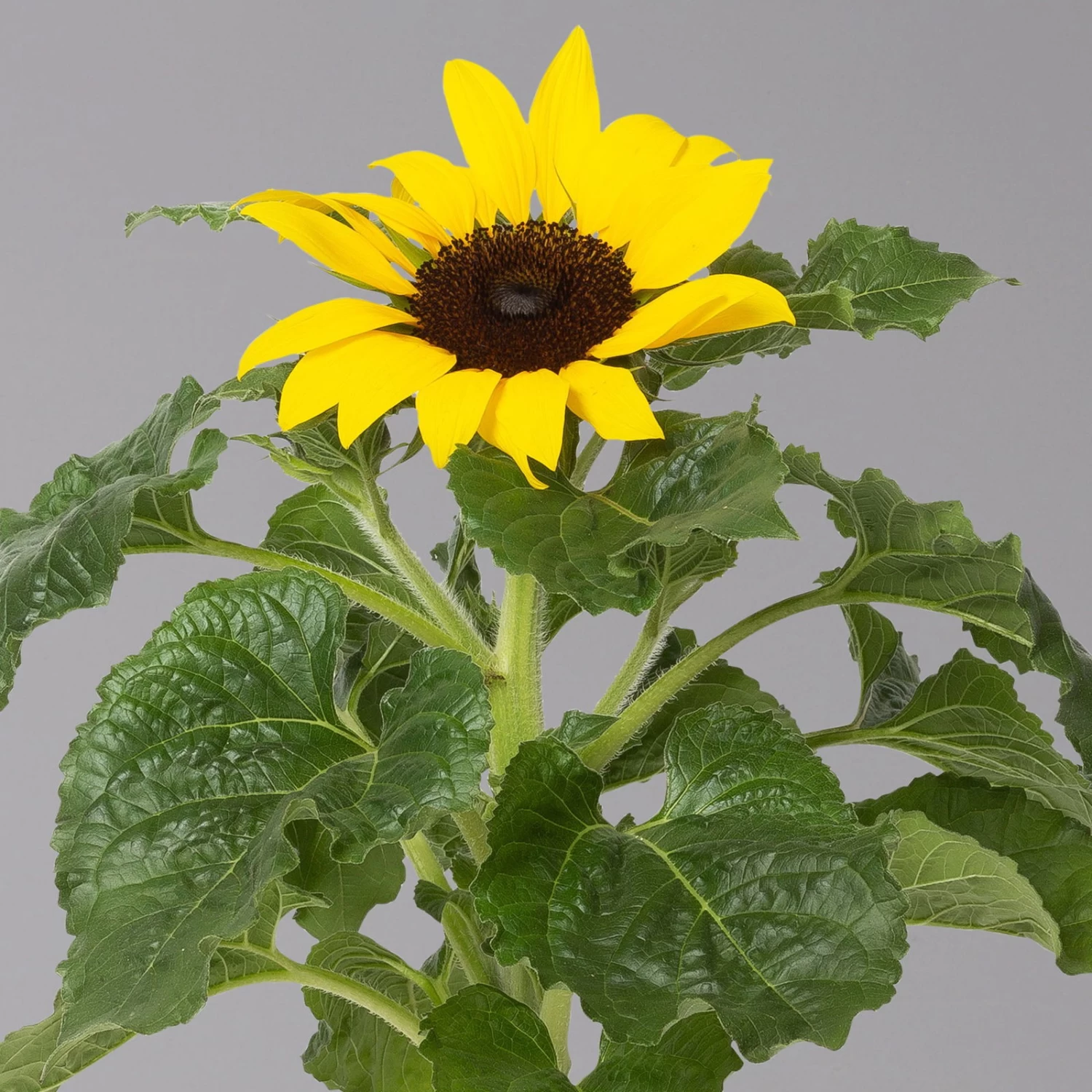 Die etwas rauen, annähernd herzförmigen Blätter der Sonnenblume (Helianthus annuus ‚Sunsation’®) überzeugen mit einem leicht matten Grün. Die Sonnenblume ‚Sunsation’® wächst aufrecht und ist vom Gärtner extra klein gehalten worden, sodass sie sich gut für den Topf eignet. Die einjährige, krautige Pflanze kann eine Wuchshöhe von ca. 50 cm erreichen.