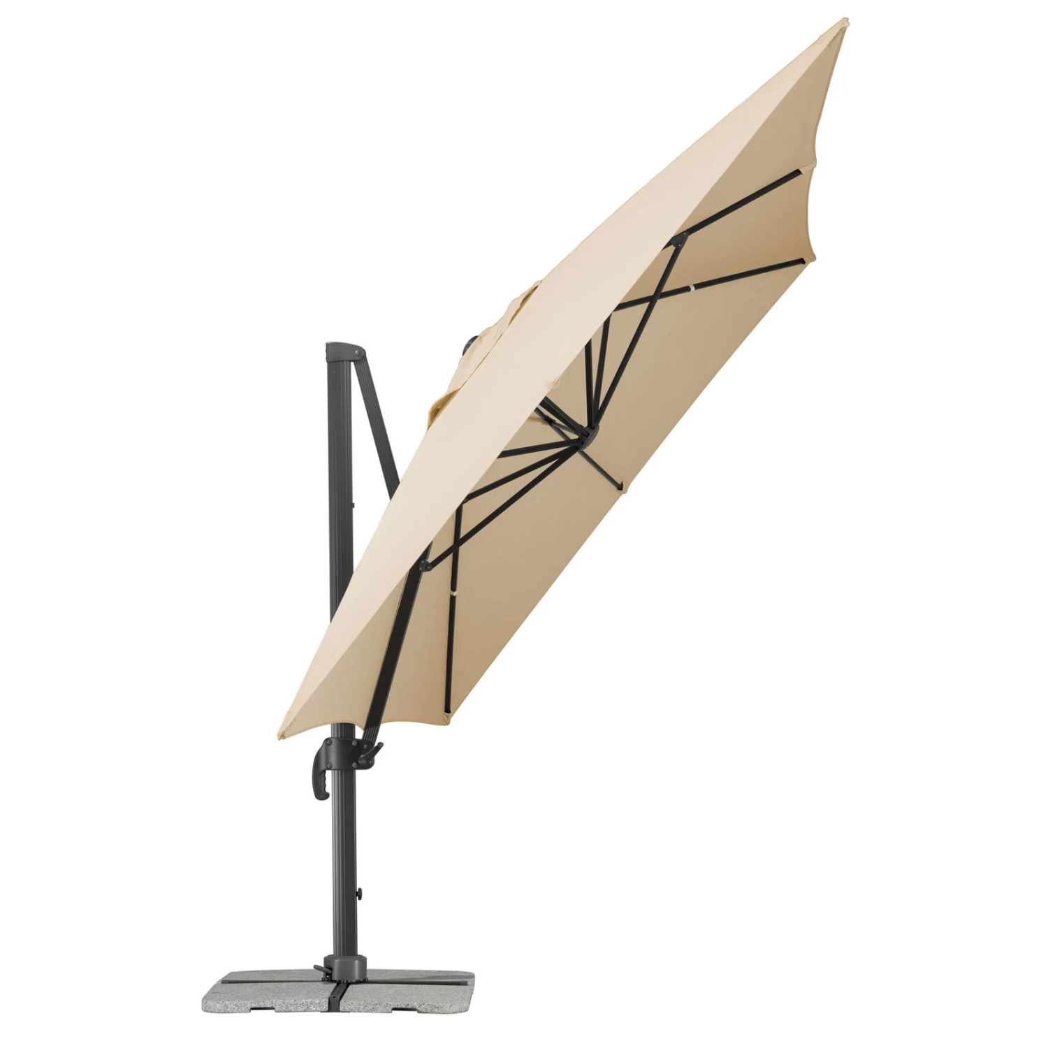 Der Sonnenschirm Rhodos Grande von Schneider lässt im Handumdrehen überall im Garten oder auf der Terrasse eine großzügig dimensionierte schattige Oase entstehen. Diesen hochwertigen Pendelschirm passen Sie mit nur wenigen Handgriffen dem Sonnenstand an. Für einen stabilen Stand benötigen Sie noch vier Betonplatten (nicht im Lieferumfang enthalten), der passende Kreuzfuß ist im Set inklusive.